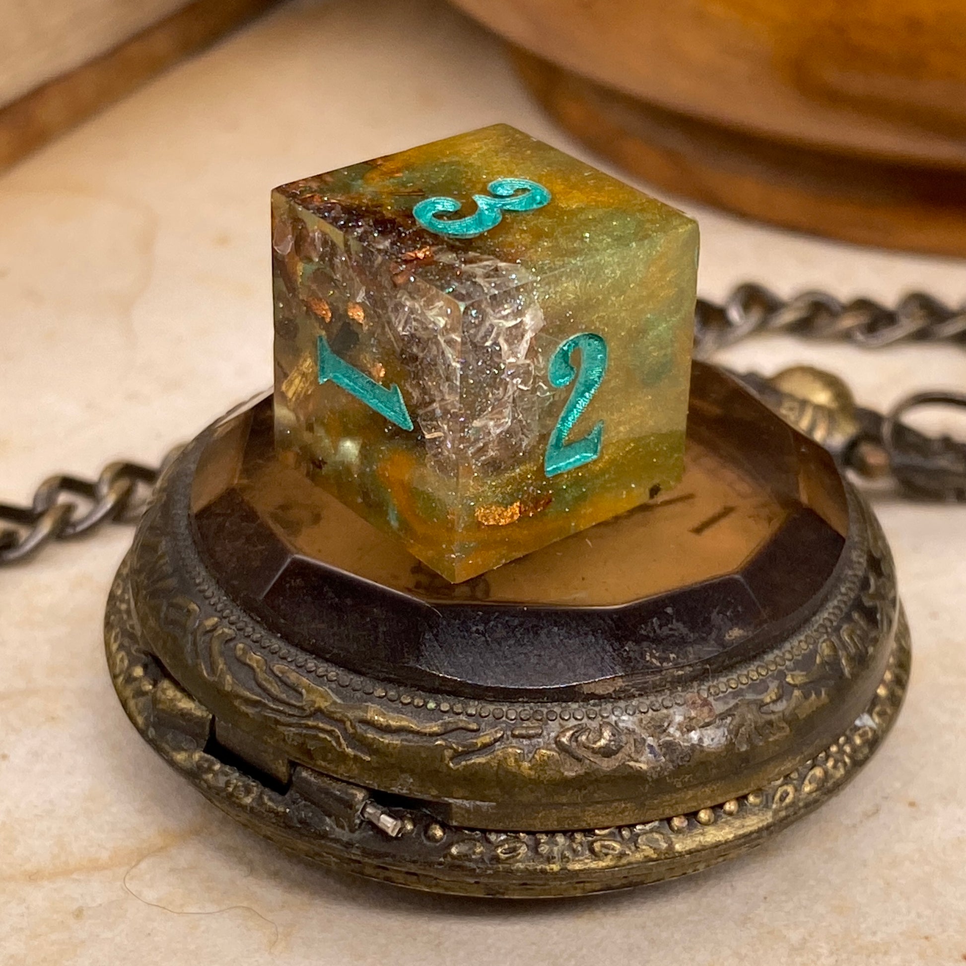 Golden ochre with the slightest hint of green swirled metallic, with shimmering clear sections tumbled together with Snake shed and tarnished copper flakes.